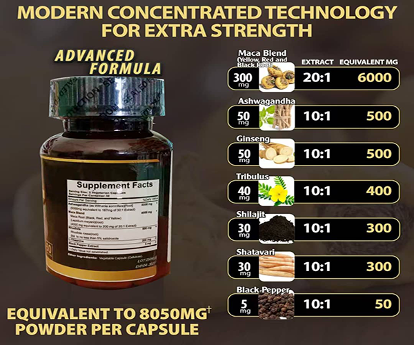 Maca pills made from 7 different natural ingredients deliver a pure, potent dose. Made with a blend of organic Maca root (red, yellow and black), Ashwagandha root, Rhodiola rosea, Ginseng root, Black Pepper extract, Tribulus Terrestris, L-Theanine etc.